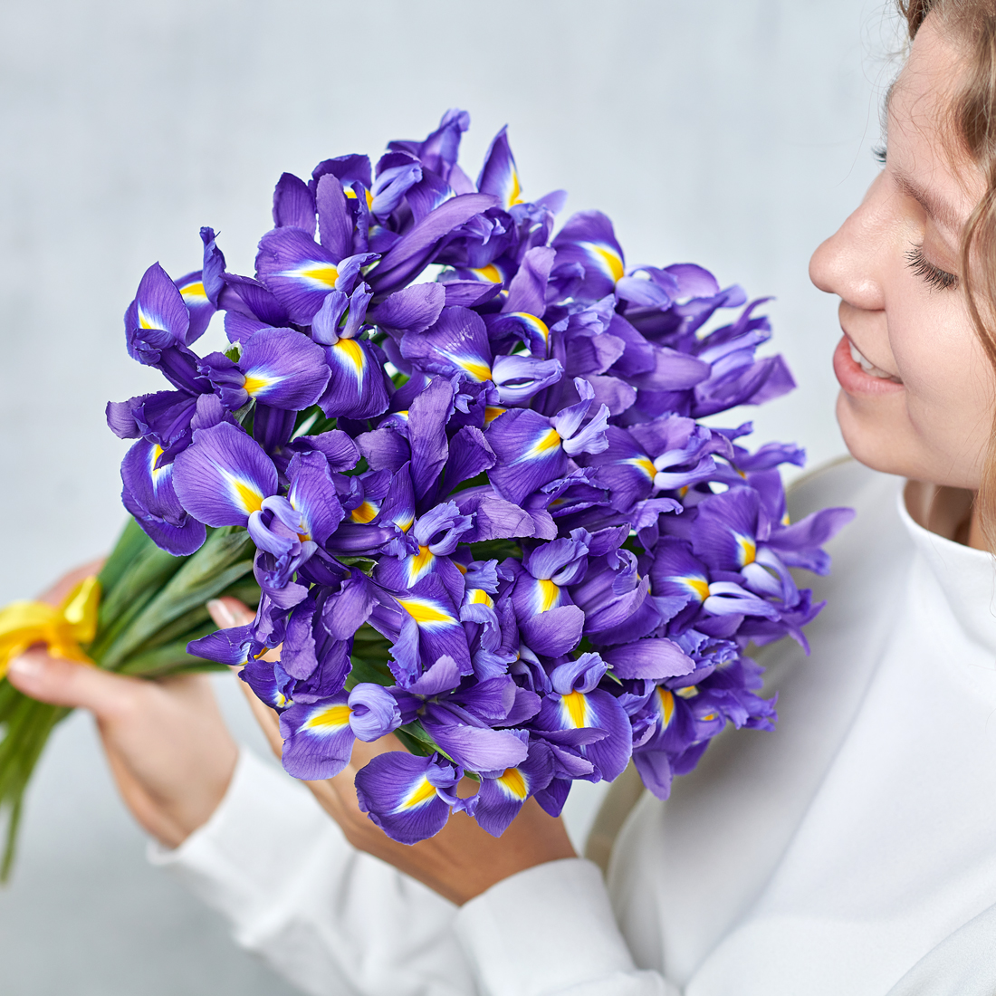 Ирисы - уникальный благородный цветок, ассоциирующийся с весной, творчеством и трогательными признаниями. Возможны небольшие изменения элементов. Общий вид и композиция букета будет сохранена.