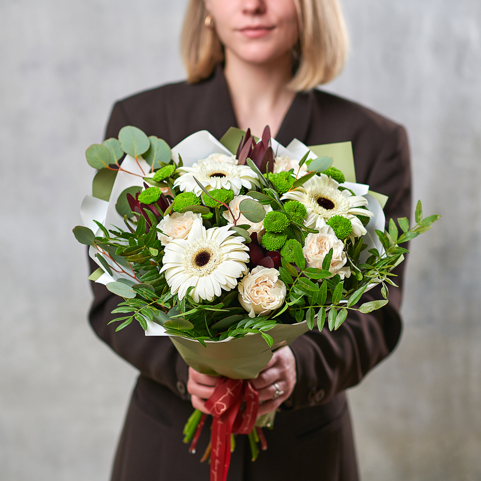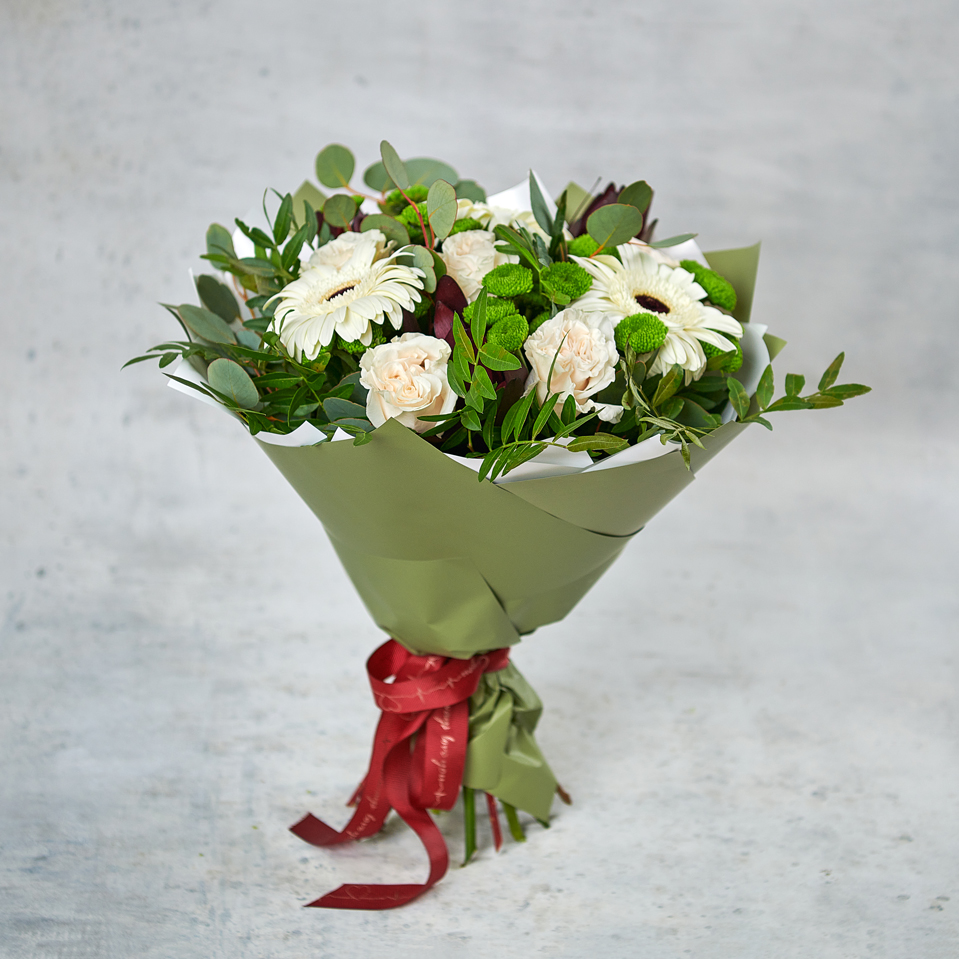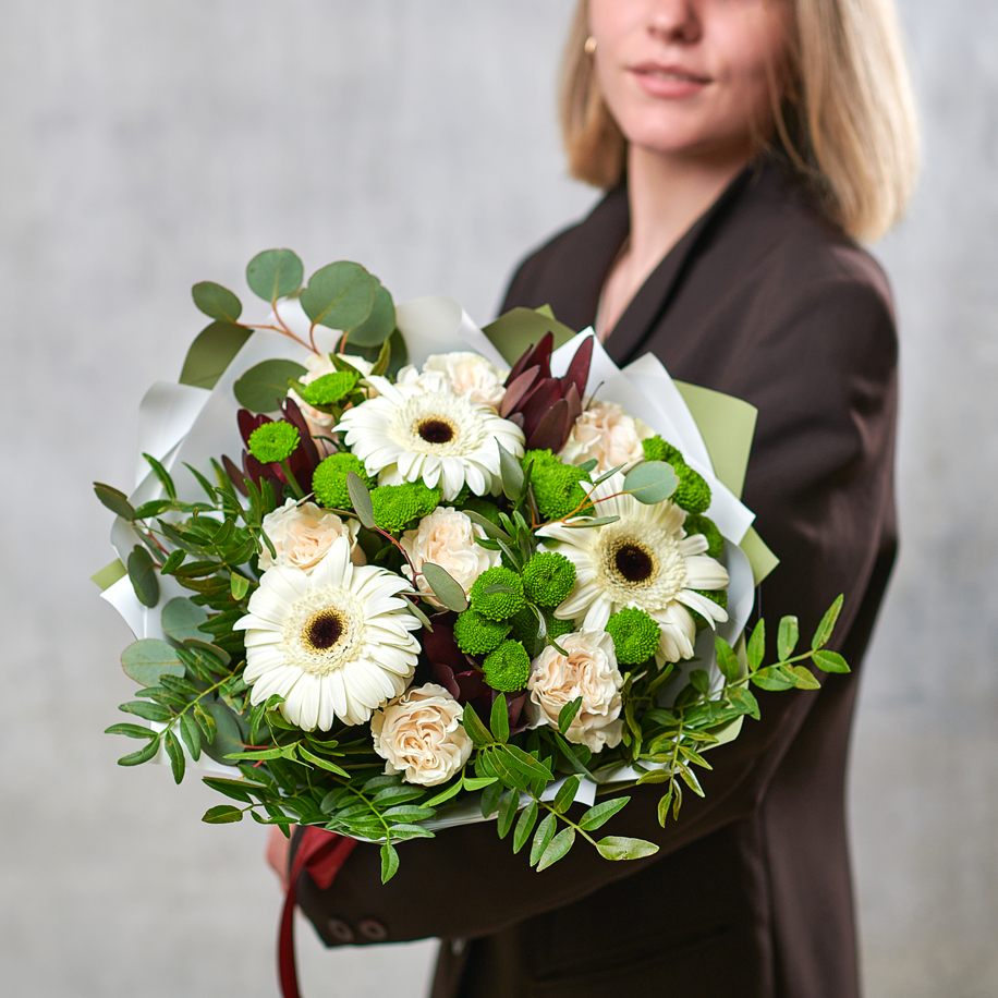 Зеленый мусс, подчеркнутый сливочными герберами, в нежной упаковке подарит свежесть и легкость вашим любимым. Возможны небольшие изменения элементов. Общий вид и композиция букета будет сохранена.