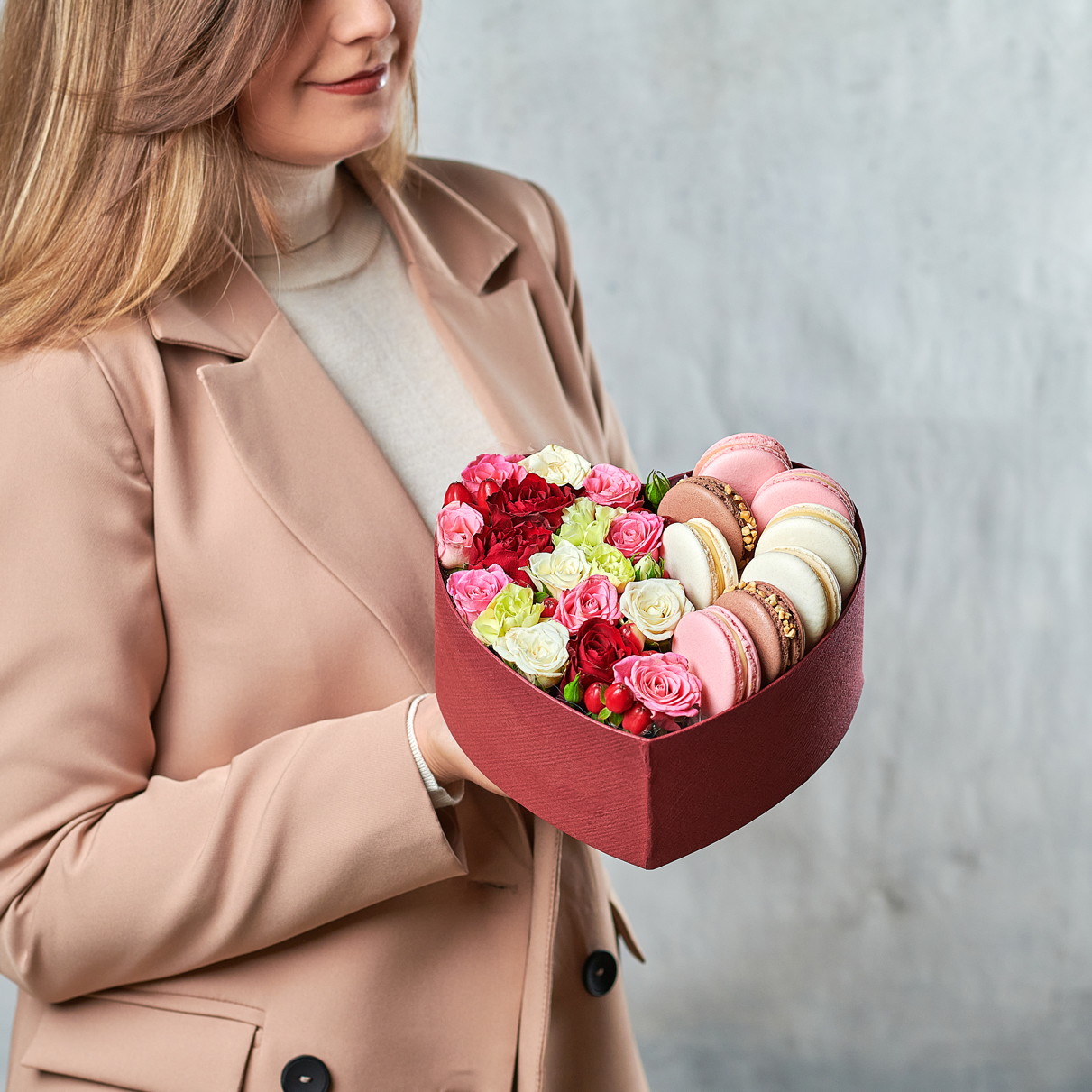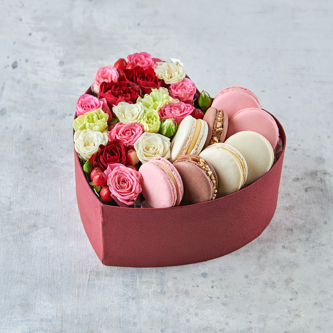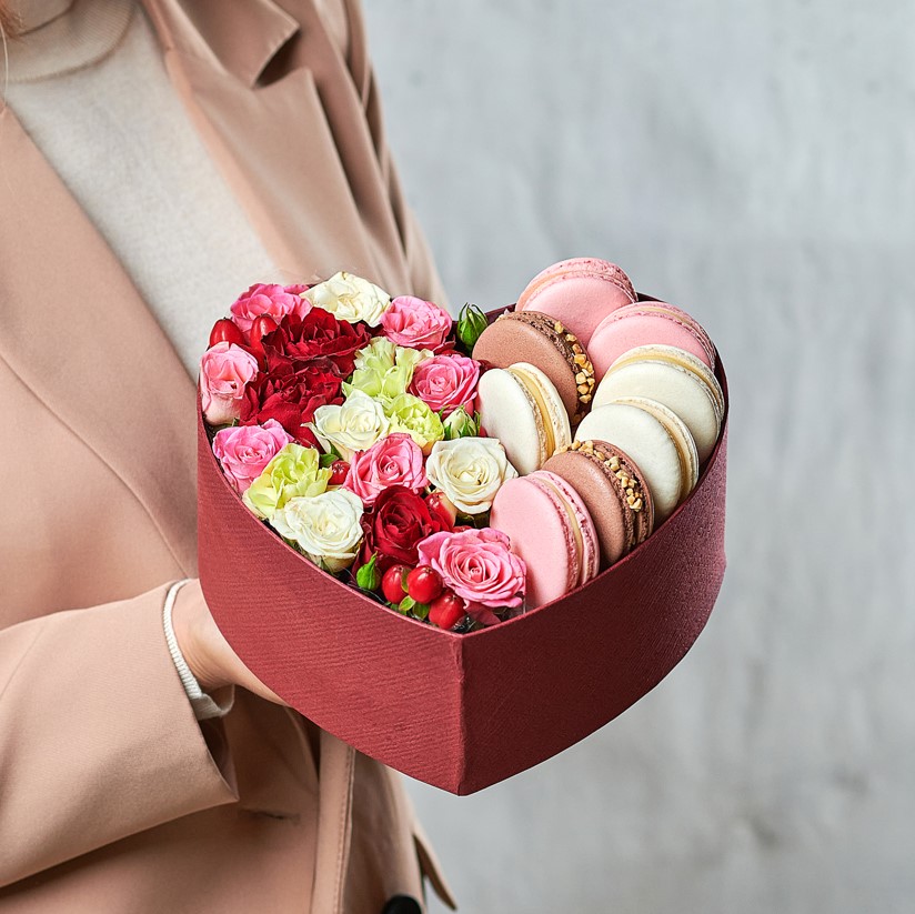 Горящее сердце, отрытые и теплые слова - лучший подарок для любимых. Цветочные коробочки с макарунами станут идеальным сюрпризом для трогательных и нежных натур. Возможны небольшие изменения элементов. Общий вид и композиция букета будет сохранена.