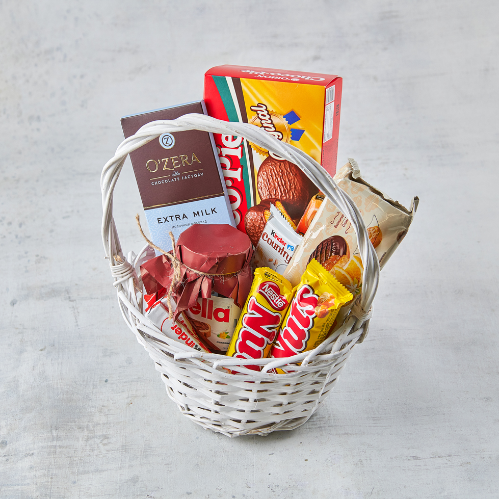 Корзина шоколадных сладостей - мечта каждой сладкоежки. Подарок, который заставит улыбнуться даже взрослых. Возможны небольшие изменения элементов. Общий вид и композиция букета будет сохранена.