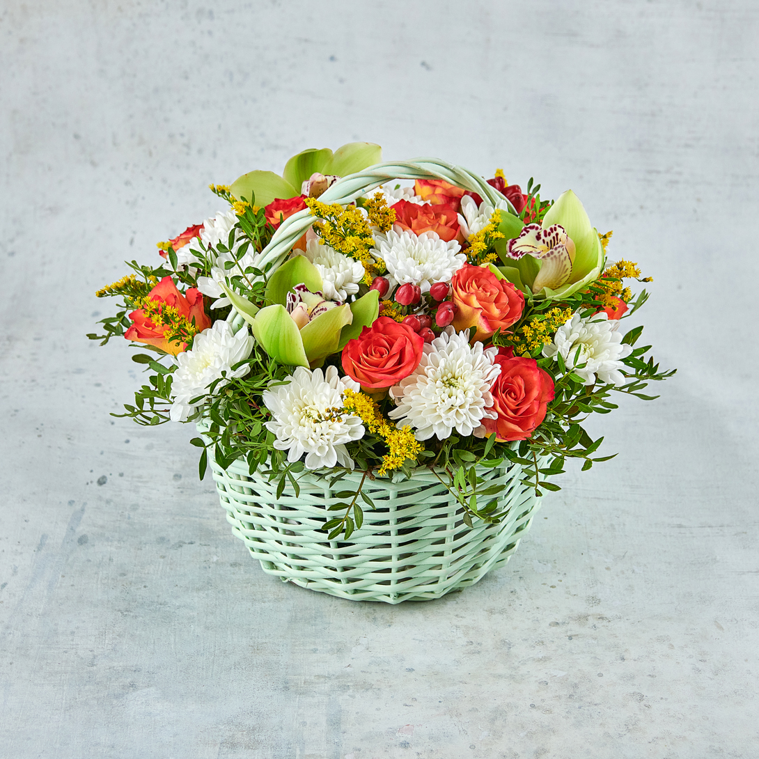 Безупречность в каждом бутоне композиции "Шарлотта". Орхидеи "Цимбидиум", роскошные розы и снежная россыпь хризантем - волшебный состав в плетеной корзине для настоящих королевских особ. Такой подарок точно запомнится надолго. Возможны небольшие изменения элементов. Общий вид и композиция букета будет сохранена.