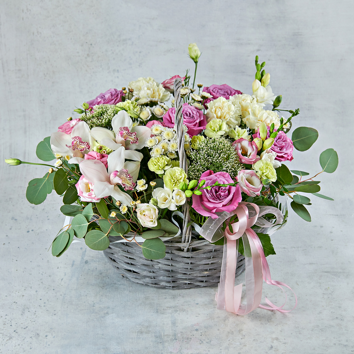 Огромный сад свежих цветов, собранный в корзину. Для тех, кто любит широкие жесты и объемные подарки. Идеальное сочетание цвета, формы и фактур. Возможны небольшие изменения элементов. Общий вид и композиция букета будет сохранена.
