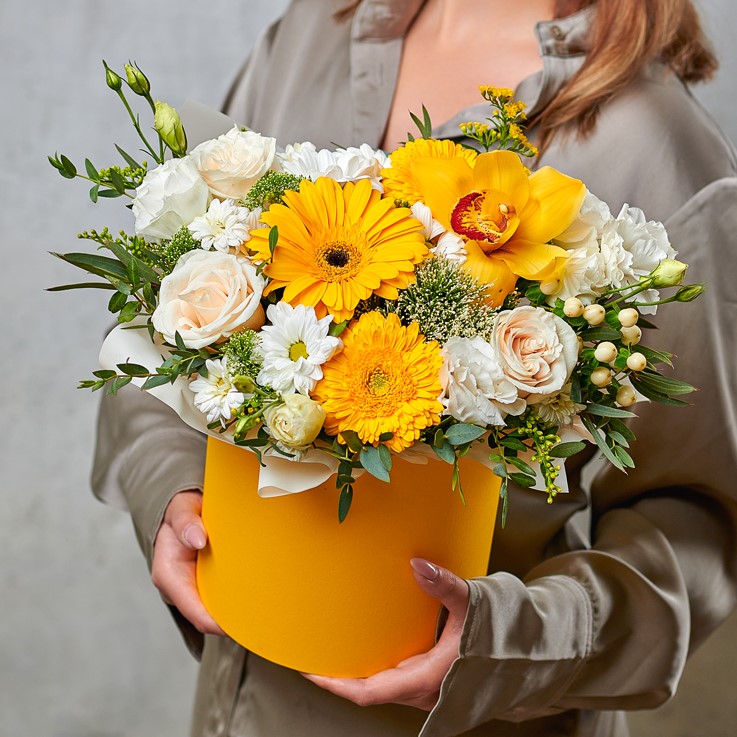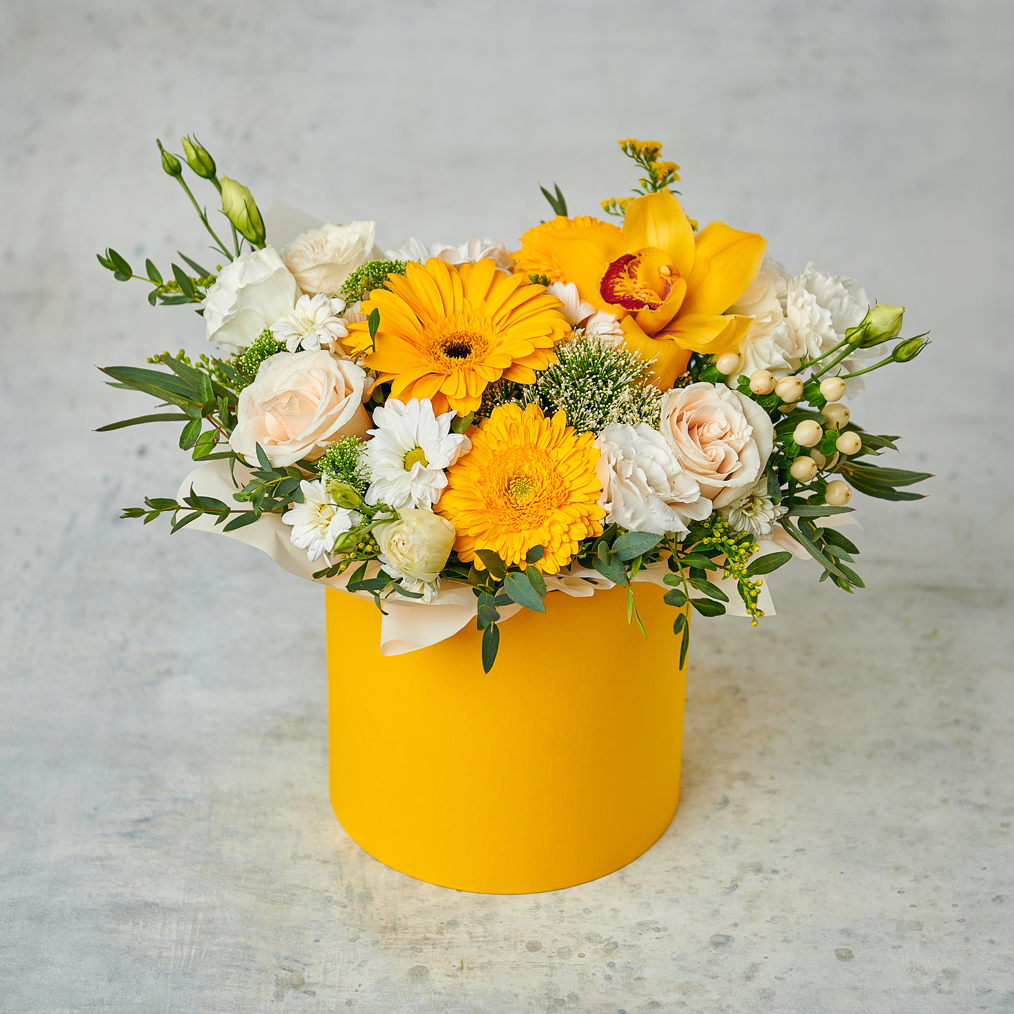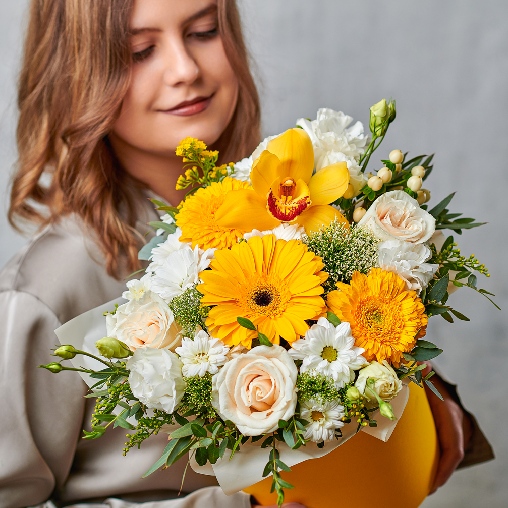 Яркая, радостная и незабываемая, словно пронзительная встреча. Композиция выполнена из нежных роз, африканских ромашек, экзотических орхидей и чудной зелени. Возможны небольшие изменения элементов. Общий вид и композиция букета будет сохранена.