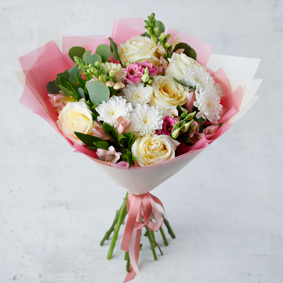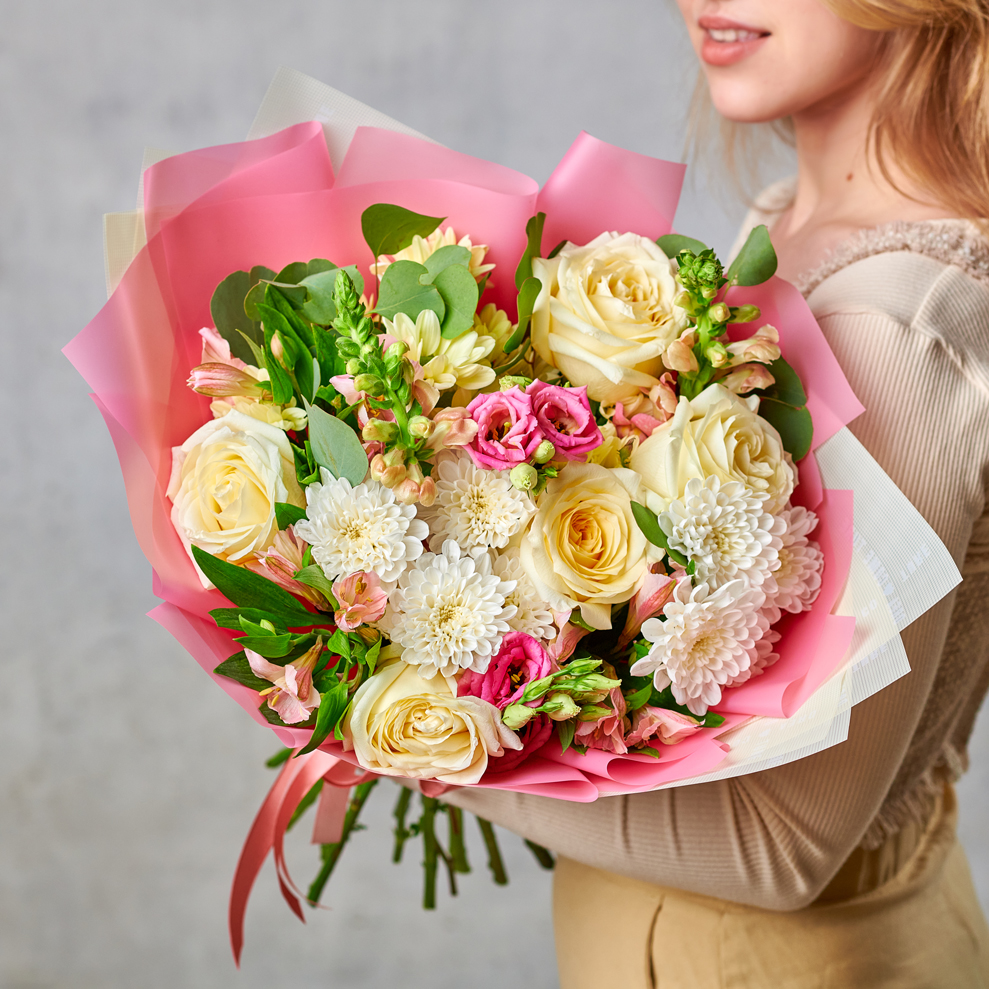Взбитые кружева прекрасных роз, нежная эустома, хрустящая хризантема - сочетание, которым захочется восхищаться снова и снова. Нежность бутонов подчеркнута воздушной упаковкой, обрамленной атласной лентой. Прекрасный выбор для тех, кто ценит глубину чувств и обожает ловить каждое мгновение.Возможны небольшие изменения элементов. Общий вид и композиция букета будет сохранена.