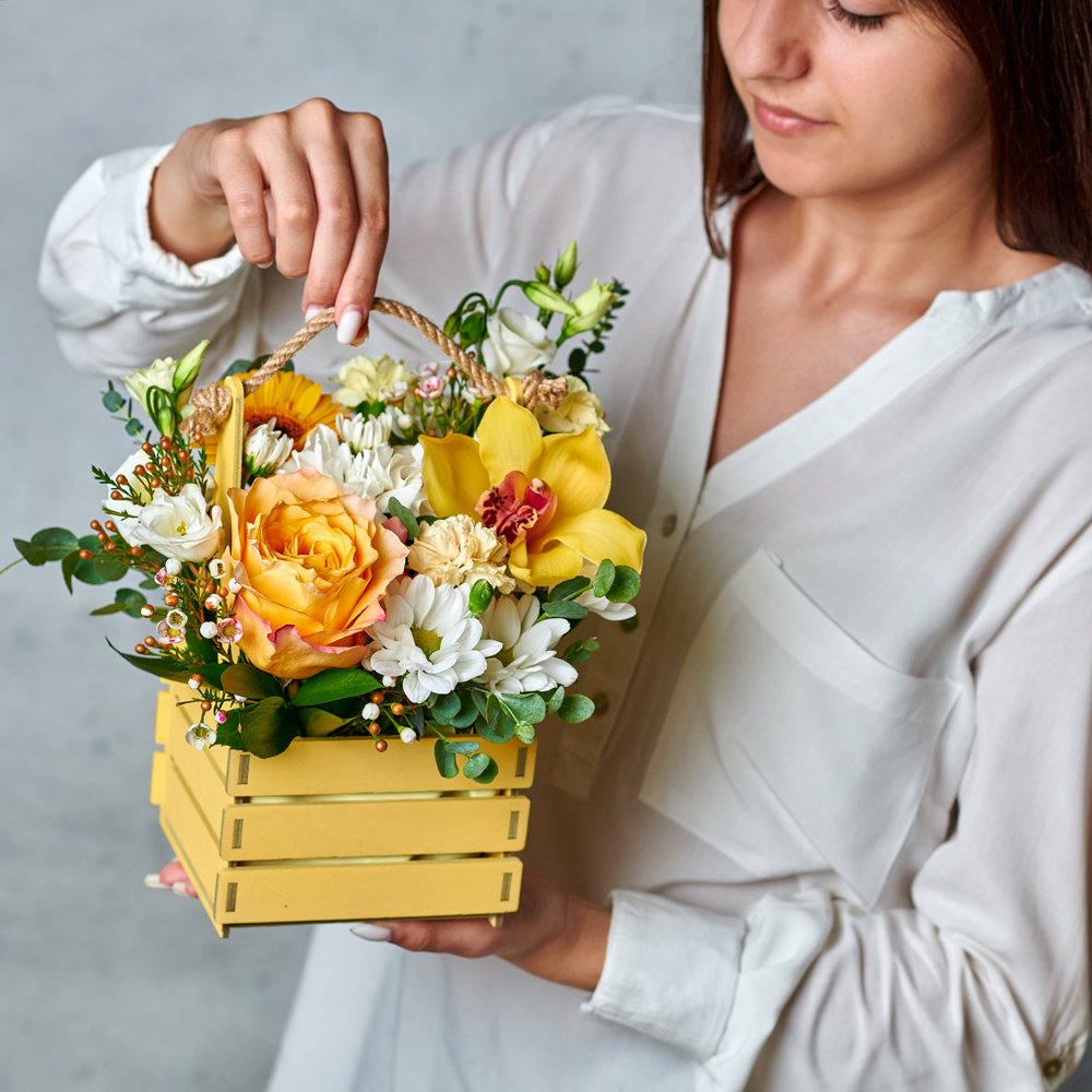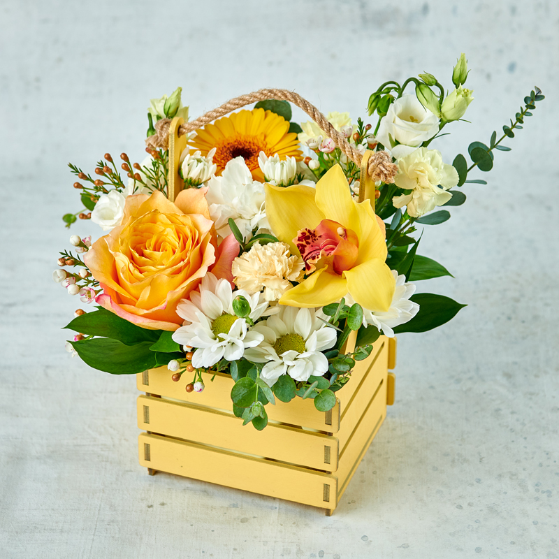 Солнечные и теплые композиции, словно песочный берег в летний день, окутают заботой и согреют даже самых невозмутимых натур. Возможны небольшие изменения элементов. Общий вид и композиция букета будет сохранена.