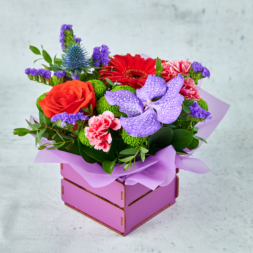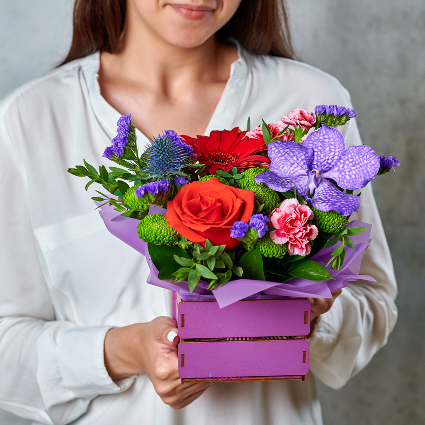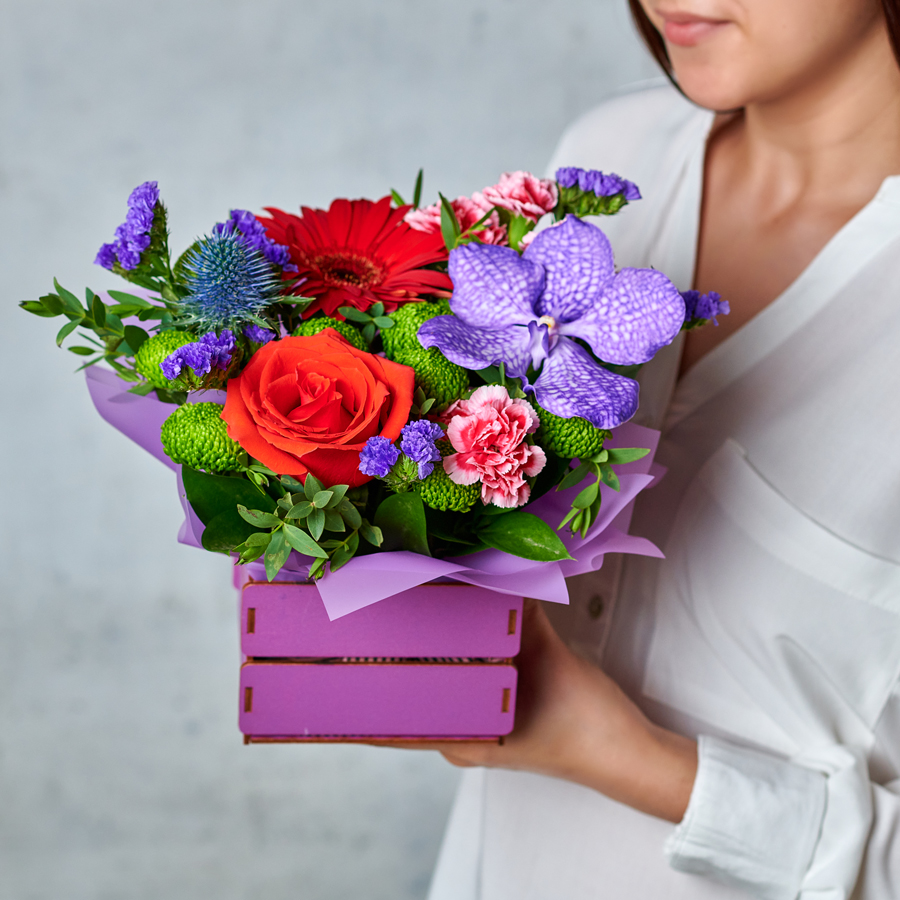 Контрасты никогда не выйдут из моды, особенно, когда речь идет о насыщенной палитре. Яркие акценты из алой розы и африканской ромашки завораживают и придают энергии, а чудная "Ванда" таинственности и изящности. Возможны небольшие изменения элементов. Общий вид и композиция букета будет сохранена.
