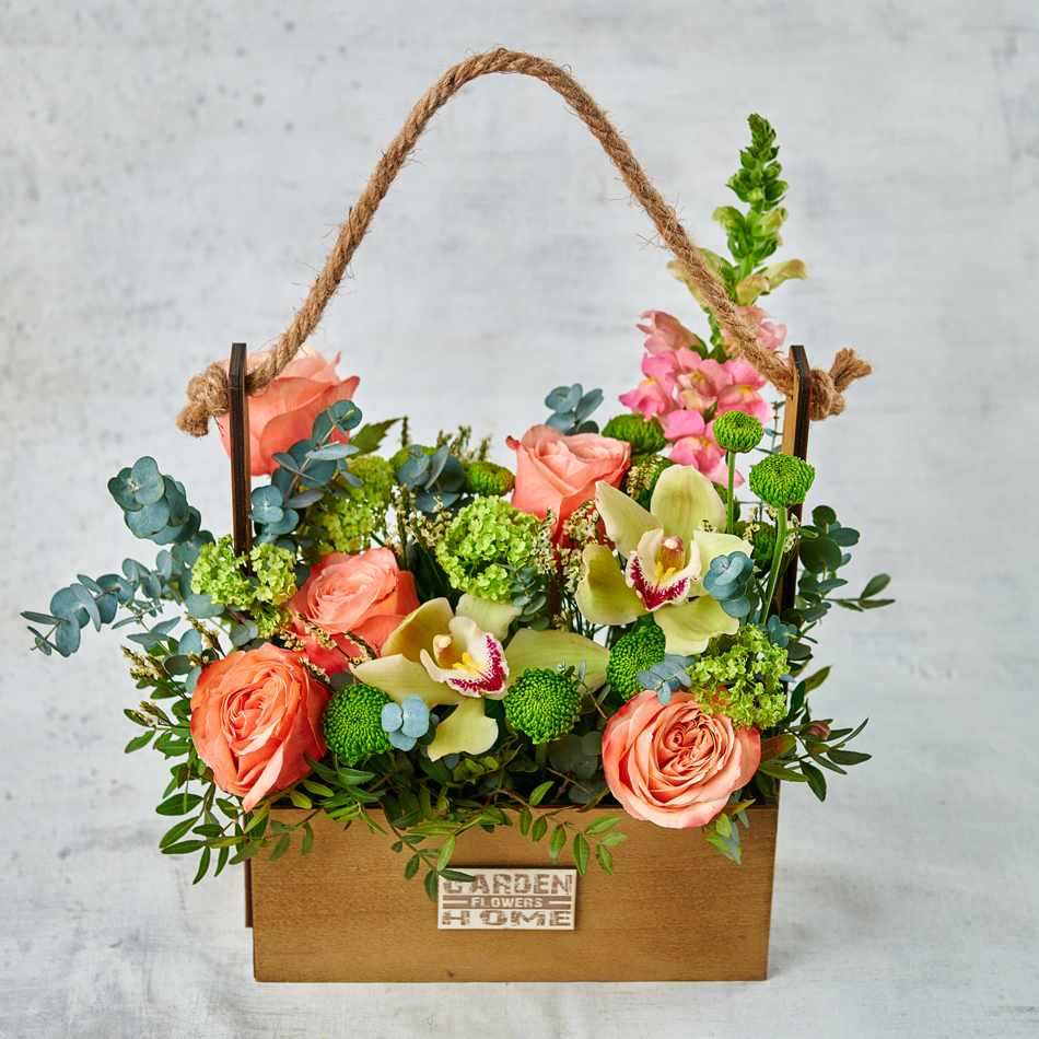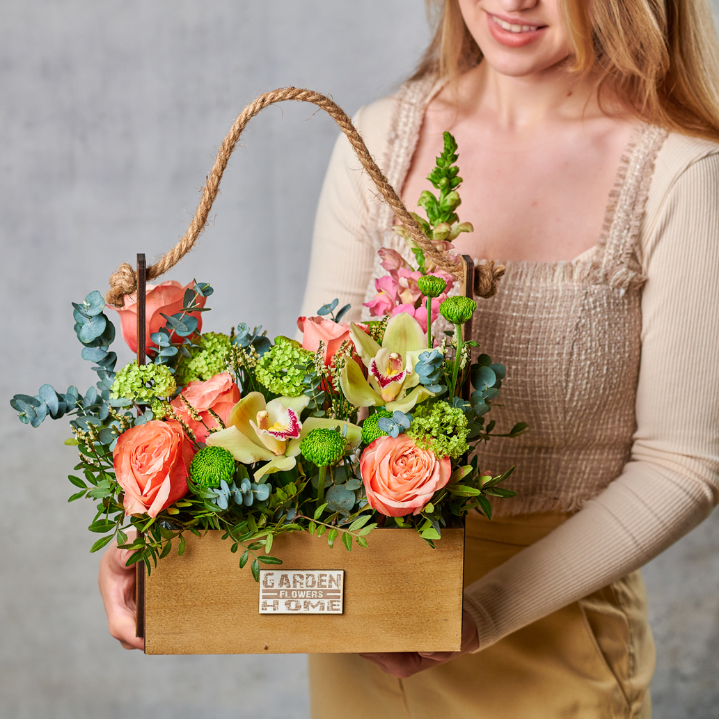 Цветочный ящик, вдохновленный свежестью летних садов подарит самые яркие эмоции. Персиковые оттенки роз раскрываются в сочетании с нежной зеленью подарят улыбку на весь день. Возможны небольшие изменения элементов. Общий вид и композиция букета будет сохранена.