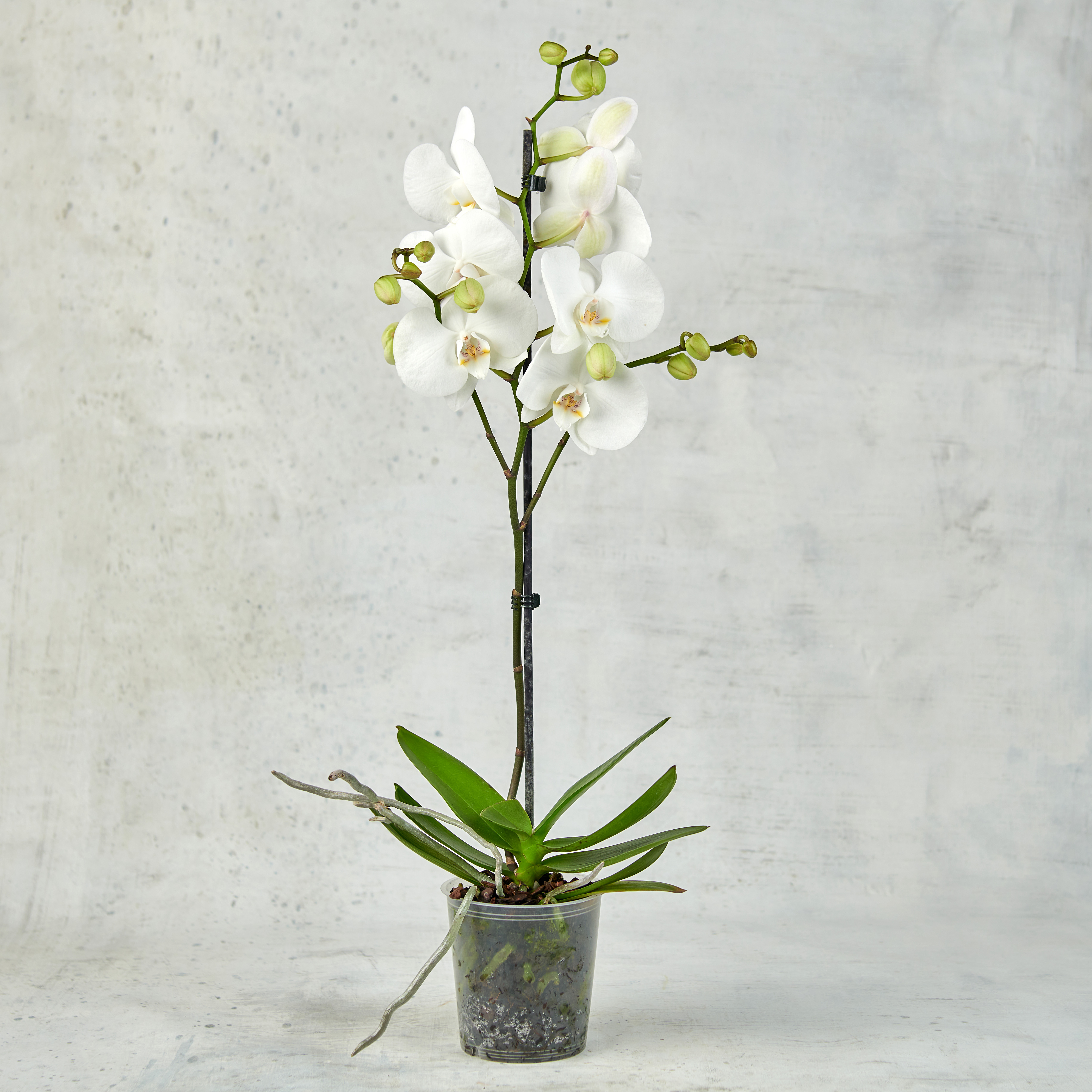 Неприхотливая, экзотичная и безумно красивая Орхидея Фаленопсис. Она питается светом, даже корни участвуют в фотосинтезе, именно поэтому ей очень нравится быть в прозрачном кашпо, берите на заметку! Поливать ее стоит не сверху, а в поддон. Избегайте попадания воды на листья во время полива (можно использовать полив с погружением кашпо в ёмкость с водой). Орхидея Фаленопсис сама расскажет вам, когда потребует полива. Корни зелёные - поливать не надо, если вы заметили, что они светлеют, стоит полить, предварительно проверив влажность внутри кашпо. Возможны небольшие изменения элементов. Общий вид и композиция букета будет сохранена.
