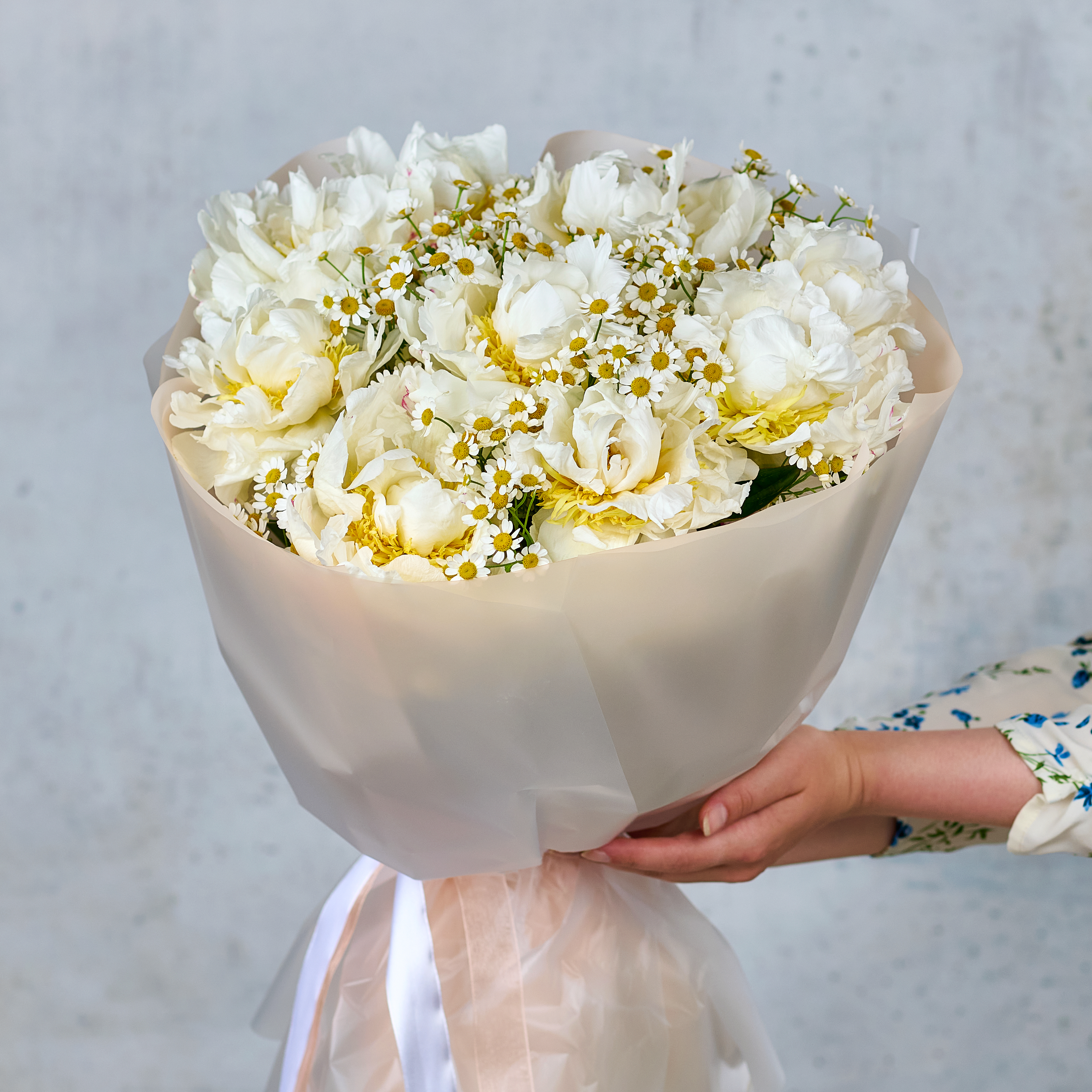 Летний изысканный букет из пионов, ромашек - сочетание, способное вскружить голову. Воздушная упаковка, классическая форма и утонченный аромат - рецепт идеального подарка. Обратите внимание, что пион - сезонный цветок, при необходимости менеджер может предложить замену, исходя из наличия товара.